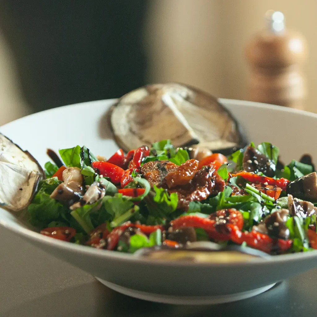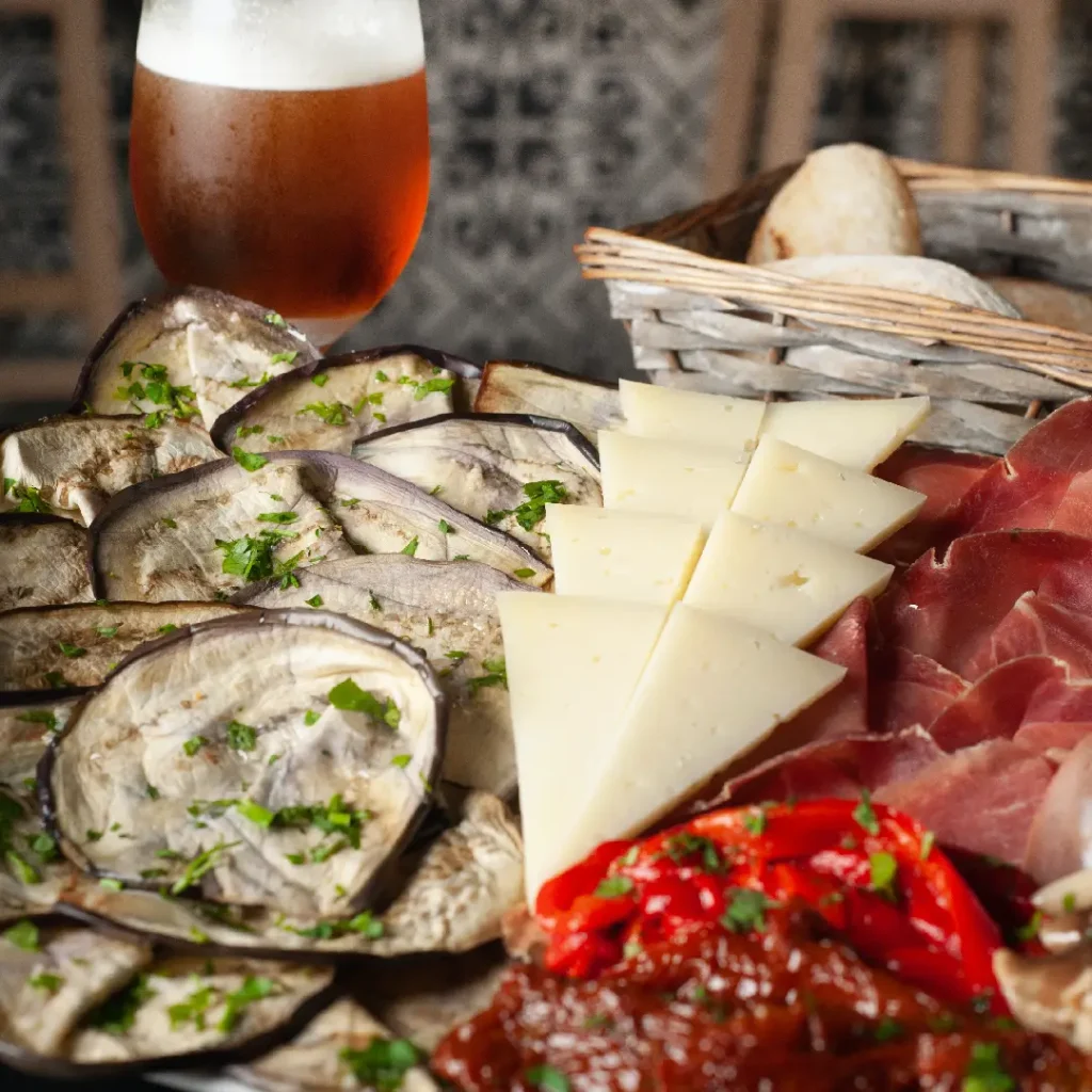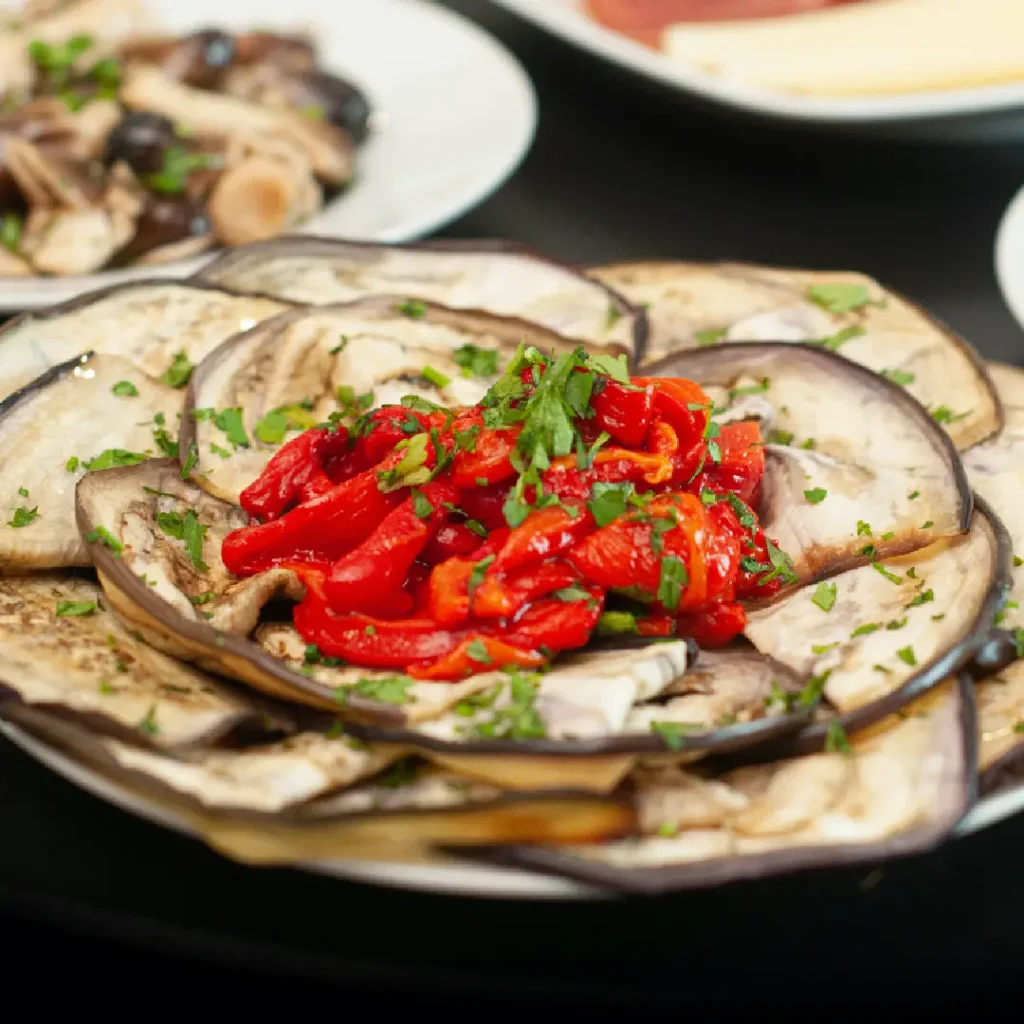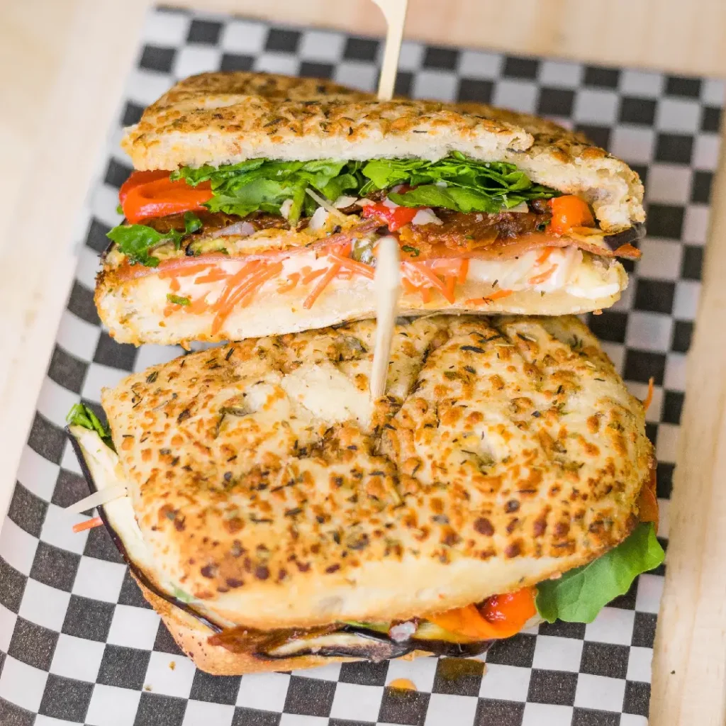 Delicioso pan focaccia con queso edam gratinado, relleno de ensalada caprichosa, pimiento asado, tomate seco, parmesado, berenjenas asadas y rúcula. Puedes pedirlo de: